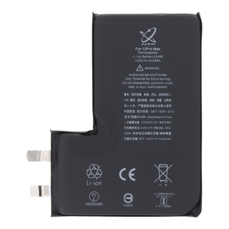 A bateria para Apple iPhone 12 Pro Max é nova, equivalente à original. Possui um APN universal e foi produzida em 2024. A voltagem é de 3.83V e não tem ciclos de carga. Trata-se de uma bateria do tipo Li-ion Polymer com capacidade de 4420 mAh.