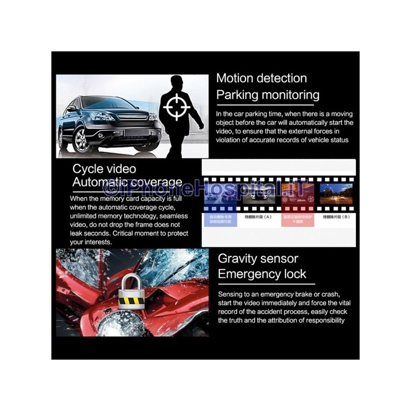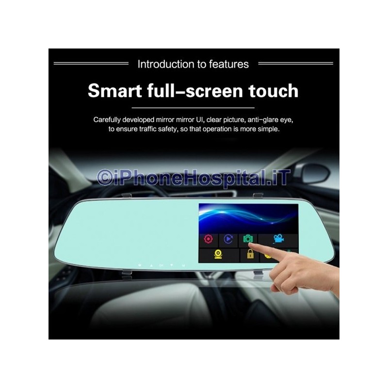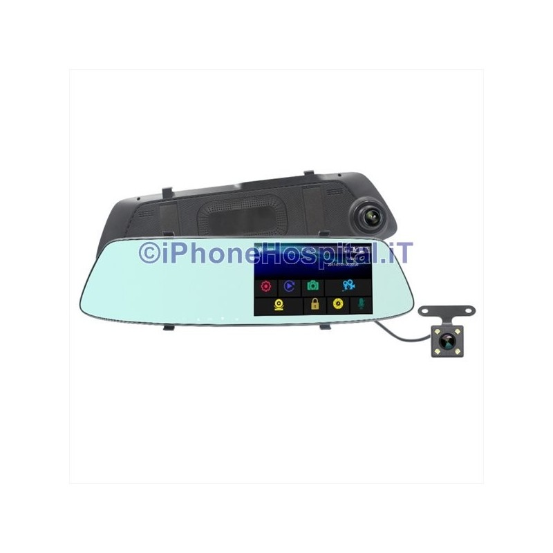 Rearview mirror with DVR video recorder, LCD touch screen monitor for recording the car journey with 2 cameras, one internal to the DVR and another external that can be placed on the rear side of the car for reverse parking.