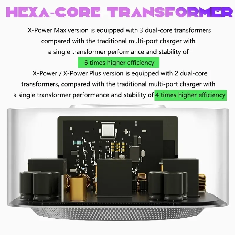 4. La versión X-Power Max cuenta con 3 transformadores de doble núcleo en comparación con los cargadores multipuerto tradicionales, con un rendimiento de transformador único y una estabilidad de eficiencia 6 veces mayor